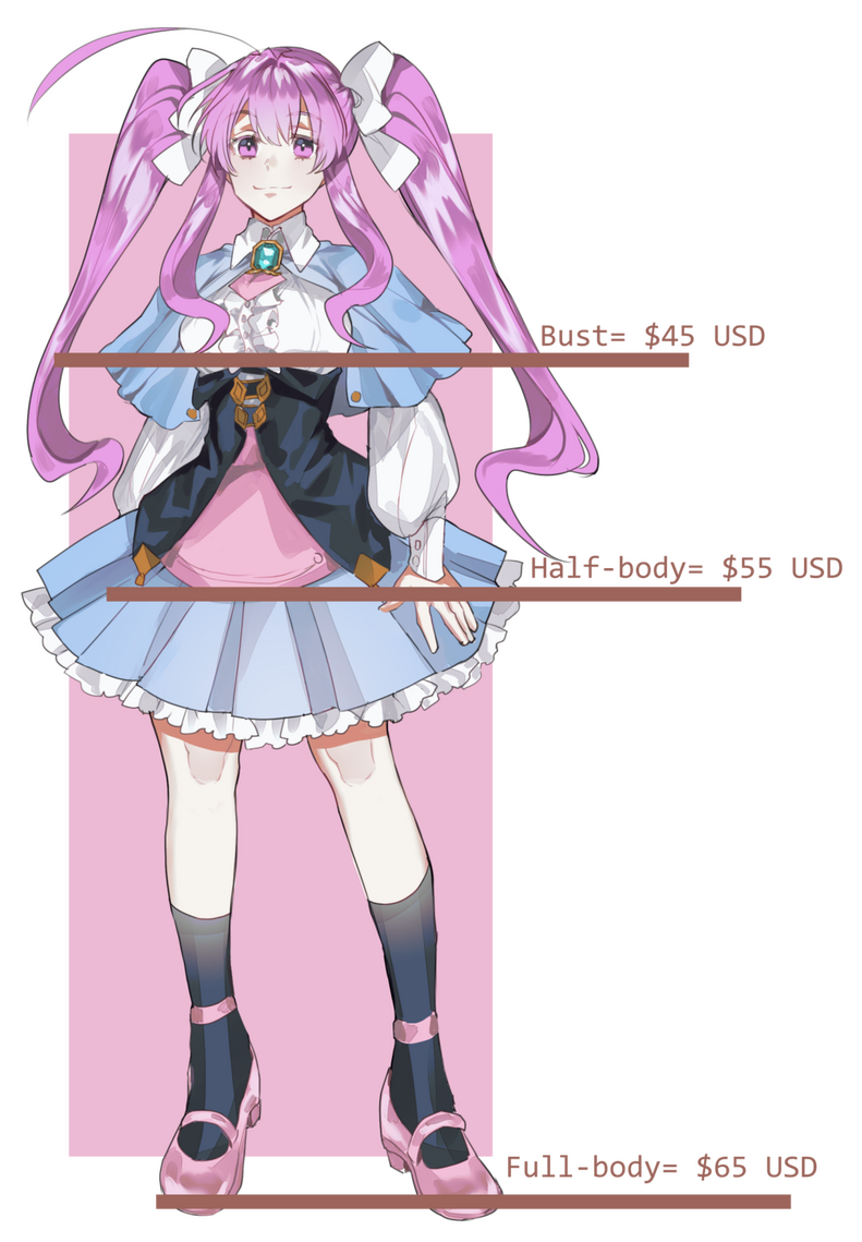 Full-body | Full-body done in similar style as examples, no background. | $65 USD | extra character= $40 USD, Background = $20 USD |
